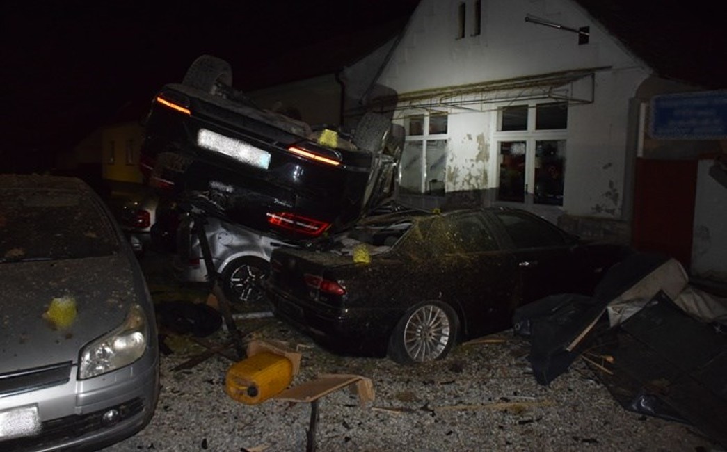 U daljnjem kretanju automobil je udario u parkirani teretni automobil, koji potom od jačine udara udario u zid i metalnu kapiju obiteljske kuće. U nastavku kretanja 39-godišnjak je sa automobilom odbačen na drugi parkirani teretni automobil, izvrnuvši isti na bočnu stranu, da bi potom nakon okretanja u zraku pao na krov tri parkirana osobna automobila.