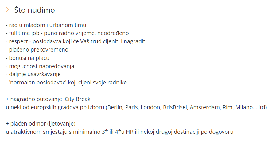 Novim zaposlenicima, između ostalog, nudi nagradno putovanje, takozvani ‘City Break’, u neki od europskih gradova po izboru te plaćeni godišnji odmor. Plaća koje se nudi je od 6500 d0 7500 kuna. Nagradno putovanje radnici imaju pravo iskoristiti nakon što odrade šest mjeseci u lokalu, a na plaćeno ljetovanje mogu ići nakon godinu dana rada, objasnio je Markoč u razgovoru za Telegram.