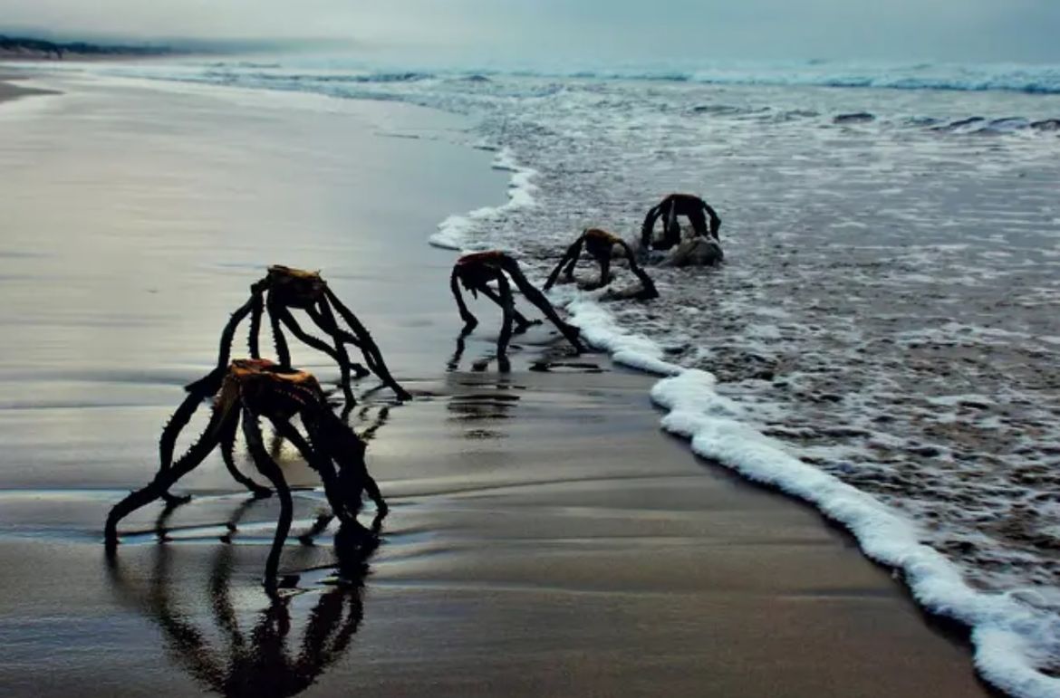Paukoviti oblici zapravo nisu vanzemaljci, već mrtve biljke aloe vere. Njihovi dugi, bodljikavi listovi uronjeni su u pijesak i izgledaju kao da su u pokretu prema naprijed, dajući biljkama uvjerljiv izgled hodanja po obali.