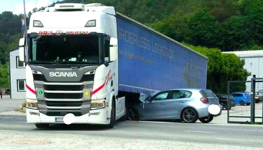 U tom trenutku s njegove lijeve strane naišao je bmw koji se nije mogao na vrijeme zaustaviti. Kako bi izbjegao sudar, skrenuo je desno te podletio pod priključno vozilo tegljača.