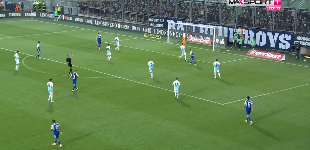 - 25 Plavi su stvorili prvu opasniju šansu preko Brune Petkovića, jako mu je malo prostora trebalo za neugodan udarac, ali Zlomislić je na mjestu.