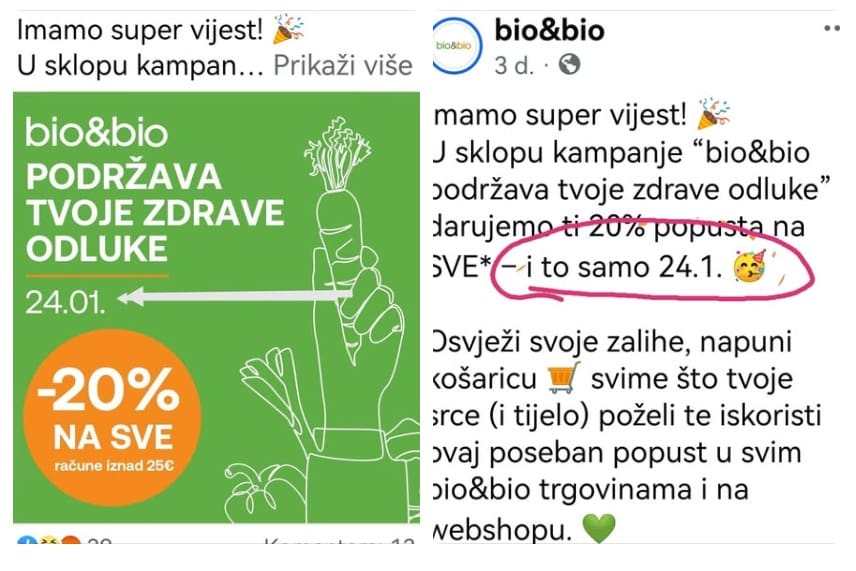 “Početkom siječnja započeli smo našu kampanju „bio&bio podržava tvoje zdrave odluke“ kako bismo te podržali u odabiru zdravijih i održivih navika. Vjerujemo da svaka odluka, pa i najmanja, čini razliku – za tvoje zdravlje i za planet. U sklopu kampanje, a kao dodatan poticaj donošenju zdravih odluka, prošli petak smo najavili i akciju 24.1. s popustom od 20% na cijeli asortiman*.  Kroz protekle dane razgovarali smo s našim kupcima, dio njih bi volio iskoristiti popust, ali i istovremeno iskazati solidarnost 24.1., što u potpunosti razumijemo. Upravo zato odlučili smo produljiti akciju i na subotu, 25.1. u svim bio&bio trgovinama i na webshopu, kako bismo što većem broju kupaca omogućili sudjelovanje u skladu s njihovim izborima”, napisali su jučer na Facebooku.