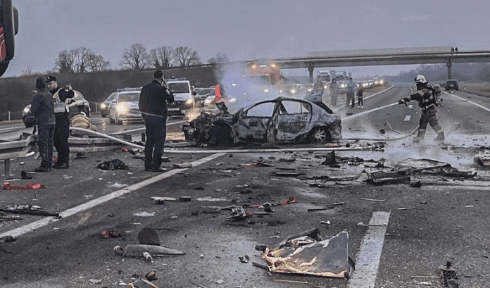 Zatim je prešao na suprotnu kolničku traku namijenjenu za promet vozila iz suprotnog smjera i udario u osobni automobil riječkih registarskih oznaka s kojim je u smjeru Karlovca upravljao nepoznati vozač. Automobil riječkih oznaka je u potpunosti izgorio te je nepoznati vozač smrtno stradao.