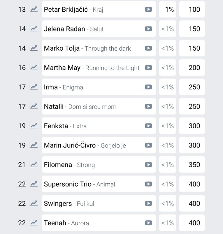Na drugom mjestu je Ogenj s pjesmom Daj, daj, a na trećem mjestu je zasad Marko Bošnjak s pjesmom Poison Cake. Najmanje šanse za pobjedu na Eurosongu ljudi daju Teenah i pjesmi Aurora.