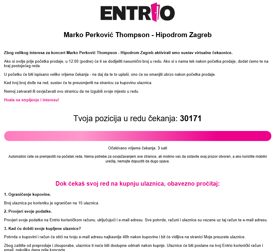 Na stranici Entrija ranije je dignuta obavijest za one koji su čekali da se otvori virtualna čekaonica. “Zbog velikog interesa za koncert Marko Perković Thompson – Hipodrom Zagreb aktivirali smo sustav virtualne čekaonice. Prodaja ulaznica počinje u četvrtak, 3. travnja u 12:00 sati (podne) na ovoj stranici. Ako si ovdje prije početka prodaje, u 12:00 će ti se dodijeliti nasumični broj u redu”, pisalo je.