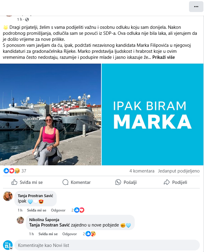 Podjele u riječkom SDP-u se nastavljaju – članica stranke Nikolina Šaponja odlučila je slijediti dio kolega i otići na izbore uz gradonačelnika Marka Filipovića. Objavila je to na društvenim mrežama, uz riječi kako s ponosom ipak staje uz Marka, no ono što je zanimljivo, jest da je upravo kao pripadnica Foruma mladih SDP-a u Rijeci Nikolina Šaponja ujedno i na plakatu kandidatkinje SDP-a Sandre Krpan., piše novi list