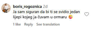 Nažalost, objavu je vidio i Boris Rogoznica, koji je iz nepoznatog razloga reel o putovanjima shvatio kao priliku za ulet. Nakon toga odlučio je preskočiti formalnosti i prijeći u napad. “Ja sam siguran da bi ti se svidio jedan lijepi kojeg ja čuvam u ormaru”, napisao je glazbenik. Dodao je i emoji koji namiguje, ako nekome nije bilo jasno na što misli.