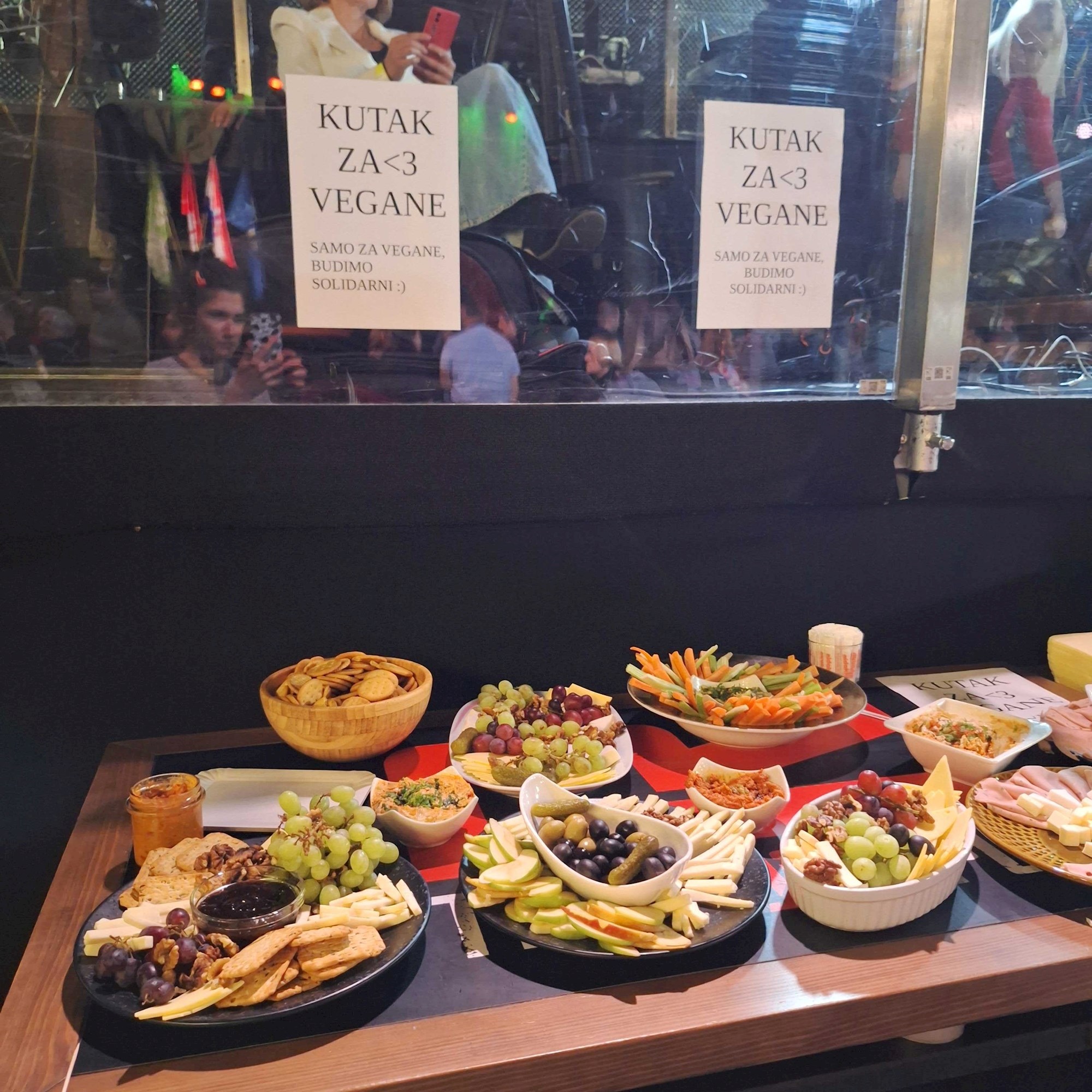 “Kutak za <3 vegane. Samo za vegane, budimo solidarni”, piše iznad plata s voćem i povrćem. Za vegane ima i krekera, ajvara i ostalih umaka…, piše index