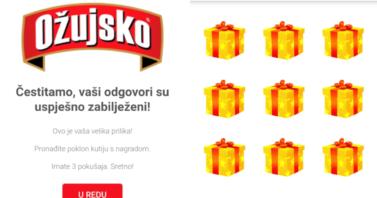 Nakon što korisnik odgovori na pitanja, prikazuje mu se obavijest kako nagrade još uvijek nisu podijeljene te se traži da u tri pokušaja pronađe kutiju s nagradom.