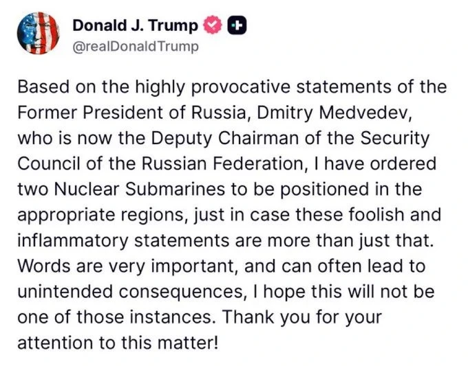 Američki predsjednik Donald Trump objavio je kako je naredio raspoređivanje dviju nuklearnih podmornica u regije blizu Rusije, reagirajući na, kako je naveo, prijeteće i provokativne izjave bivšeg ruskog predsjednika Dmitrija Medvedeva.