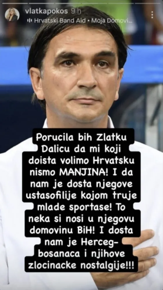 Vlatka Pokos ponovno je privukla pažnju javnosti nakon što je na Instagram storyju objavila fotografiju izbornika hrvatske nogometne reprezentacije Zlatka Dalića, optuživši ga za “ustašofiliju” i poručivši da to “nosi u svoju domovinu BiH”. Dodala je i da je “dosta Herceg-Bosanaca i njihove zločinačke nostalgije”. Objavu je ubrzo obrisala, no prije toga izazvala je niz burnih reakcija.