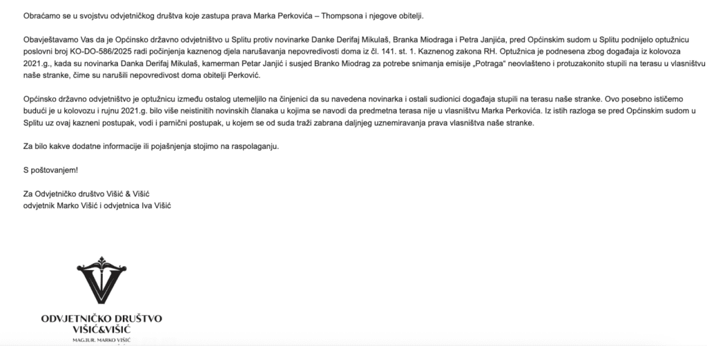 Obavještavamo Vas da je Općinsko državno odvjetništvo u Splitu protiv novinarke Danke Derifaj Mikulaš, Branka Miodraga i Petra Janjića, pred Općinskim sudom u Splitu podnijelo optužnicu poslovni broj KO-DO-586/2025 radi počinjenja kaznenog djela narušavanja nepovredivosti doma iz čl. 141. st. 1. Kaznenog zakona RH. Optužnica je podnesena zbog događaja iz kolovoza 2021.g., kada su novinarka Danka Derifaj Mikulaš, kamerman Petar Janjić i susjed Branko Miodrag za potrebe snimanja emisije „Potraga“ neovlašteno i protuzakonito stupili na terasu u vlasništvu naše stranke, čime su narušili nepovredivost doma obitelji Perković.