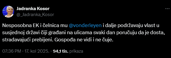 “Nesposobna EK i čelnica joj Von der Leyen i dalje podržavaju vlast u susjednoj državi čiji građani na ulicama svaki dan poručuju da je dosta, stradavaju prebijeni. Gospođa ne vidi i ne čuje.”