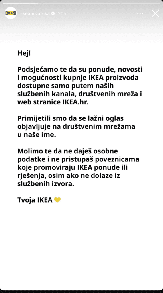 IKEA je na svom službenom Instagram profilu upozorila kupce da ne dijele osobne podatke i da ne otvaraju poveznice koje reklamiraju njihove proizvode, osim ako mogu potvrditi da se radi o službenim IKEA kanalima. Naime, na društvenim mrežama se širi lažni oglas koji koristi ime i brend tvrtke, a cilj mu je najčešće krađa osobnih podataka.
