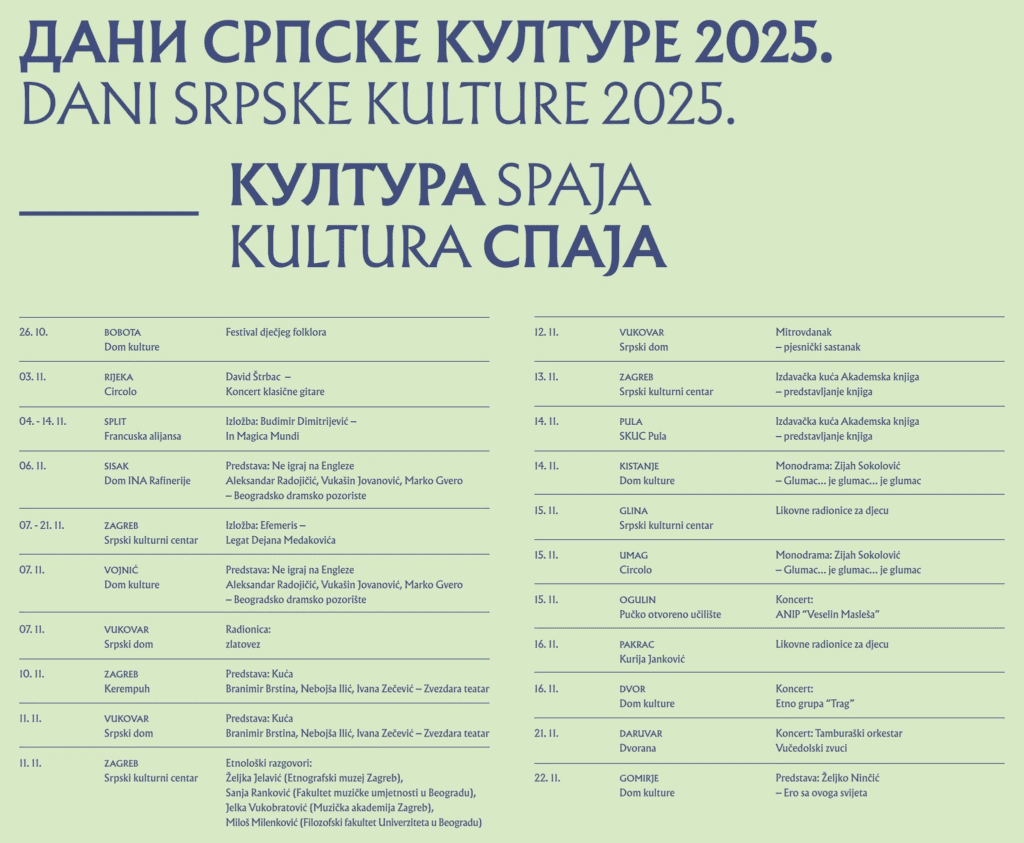 Prema rasporedu koji je objavio predsjednik SKD-a Prosvjeta Nikola Vukobratović, u sklopu Dana srpske kulture u Vukovaru tijekom studenoga održat će se nekoliko manifestacija.