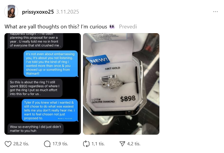 Glavna junakinja današnje priče je izazvala je burnu raspravu na društvenim mrežama nakon što je otkrila da je odbila zaručnički prsten svog dečka. Kako tvrdi, problem nije bio u cijeni prstena kupljenog u Walmartu, već u činjenici da joj partner nije kupio prsten kakav je željela, iako mu je to navodno više puta naglasila. Njezina objava na platformi Threads pokrenula je lavinu komentara o komunikaciji i trudu u vezama, pišu strani mediji.