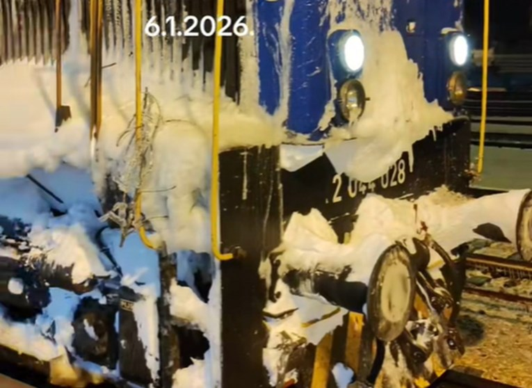 Na snimkama koje se šire po društvenim mrežama vidi se da je lokomotivu vlaka 523 iz Splita prema Zagrebu okovao zaleđeni snijeg.