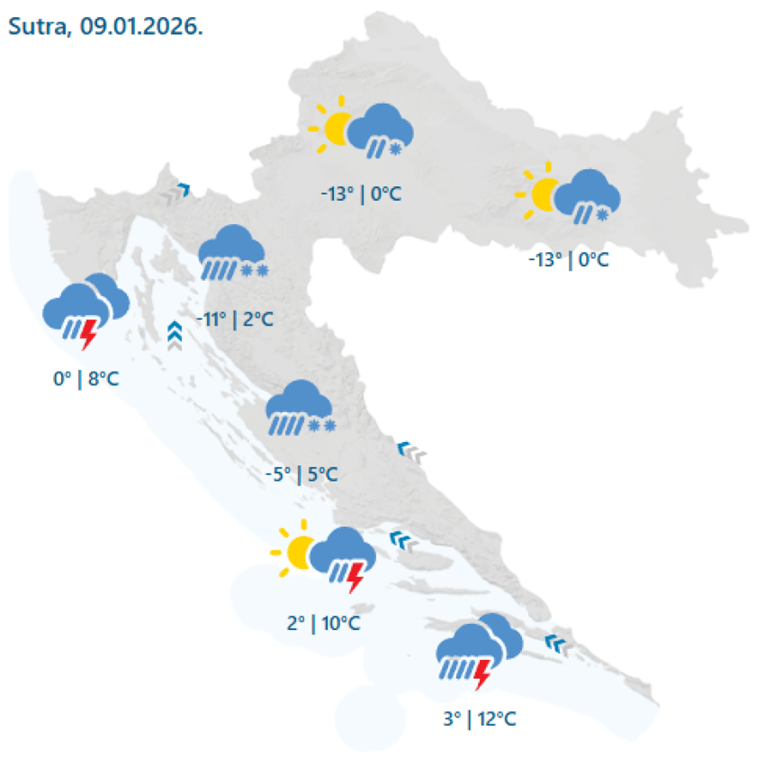 Prema prognozi, sutra će u unutrašnjosti najniža temperatura biti između -14 i -8 °C, dok će se na moru kretati od 0 do 5 °C. Iz DHMZ-a pozivaju građane da prate njihova upozorenja.
