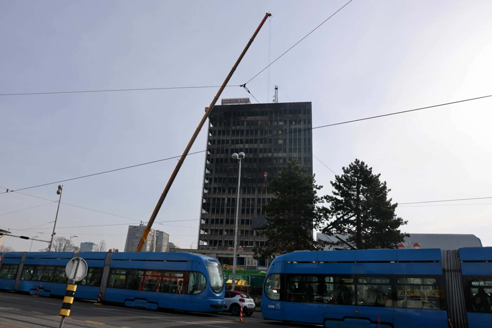 Nastavljaju se pripremni radovi za rušenje Vjesnika. Radnici su tijekom vikenda započeli uklanjati prozore i stakla. Uz sjeverni dio nebodera posut je zaštitni sloj šljunka te je postavljena golema dizalica.
